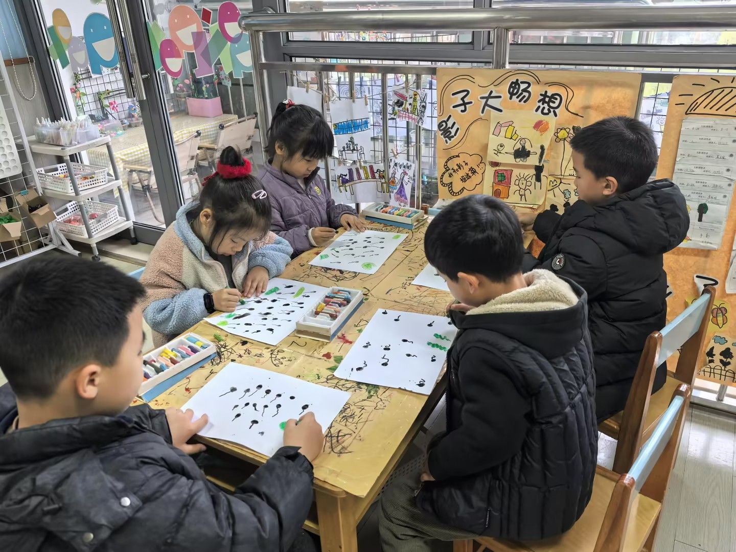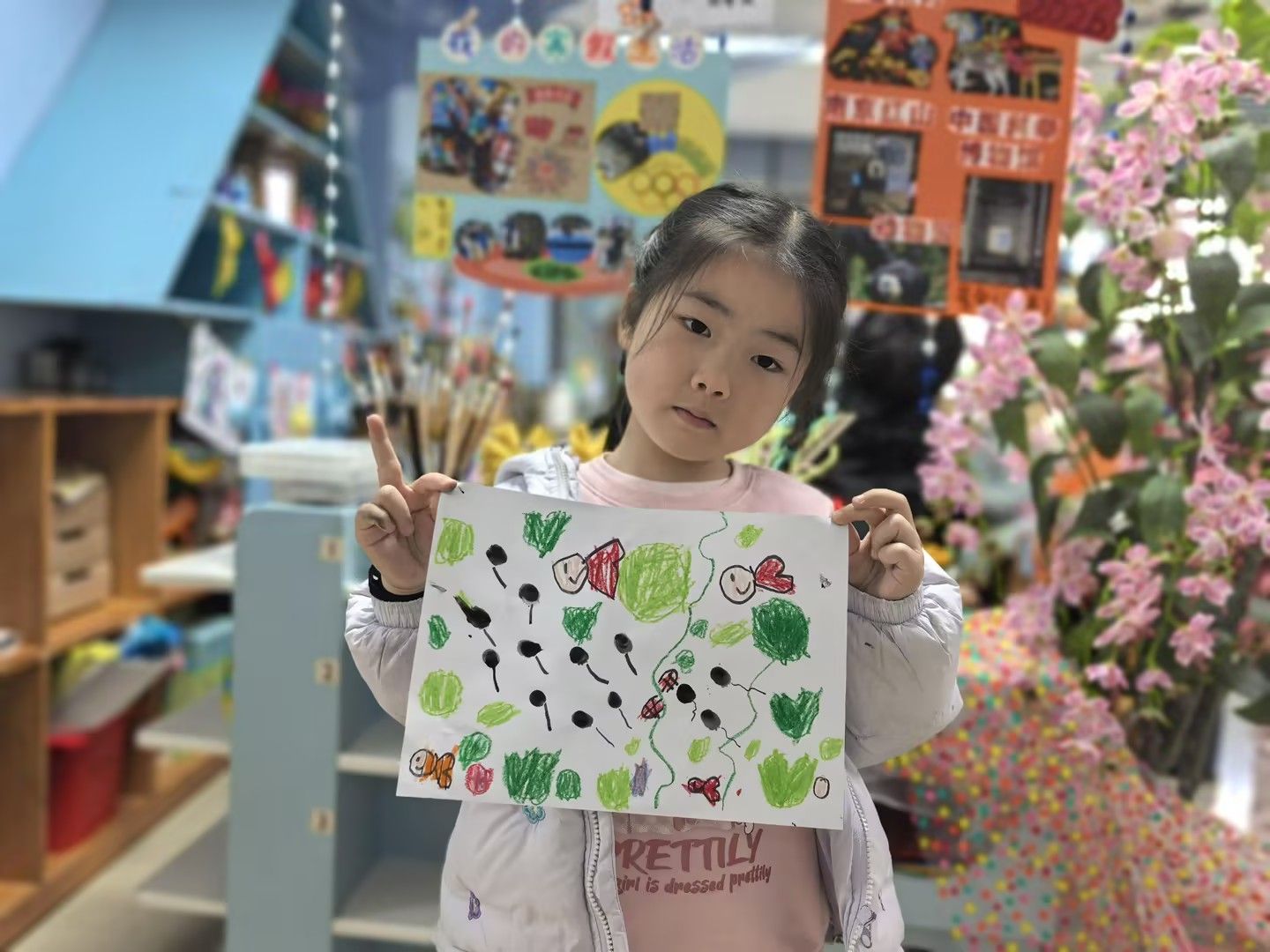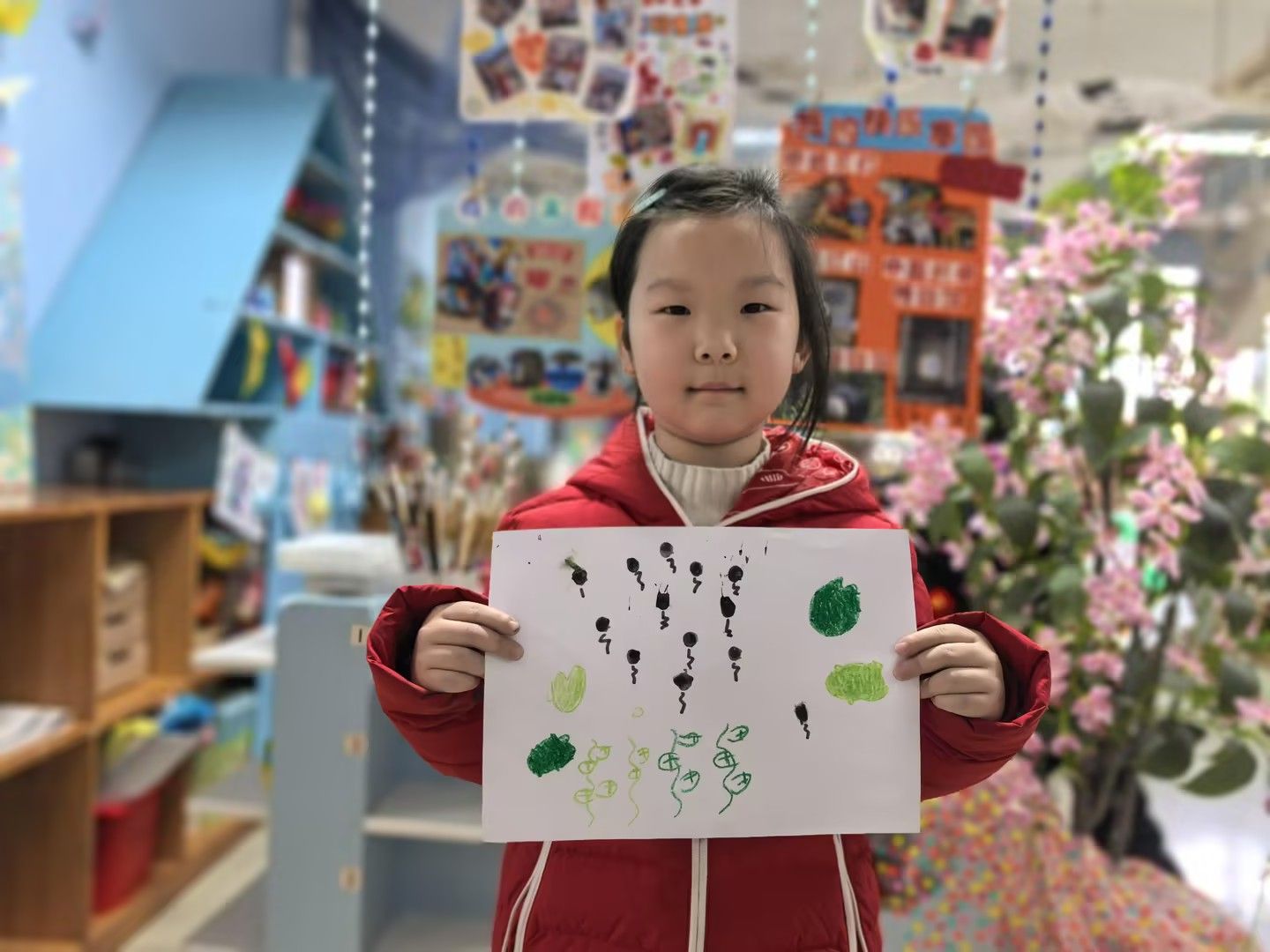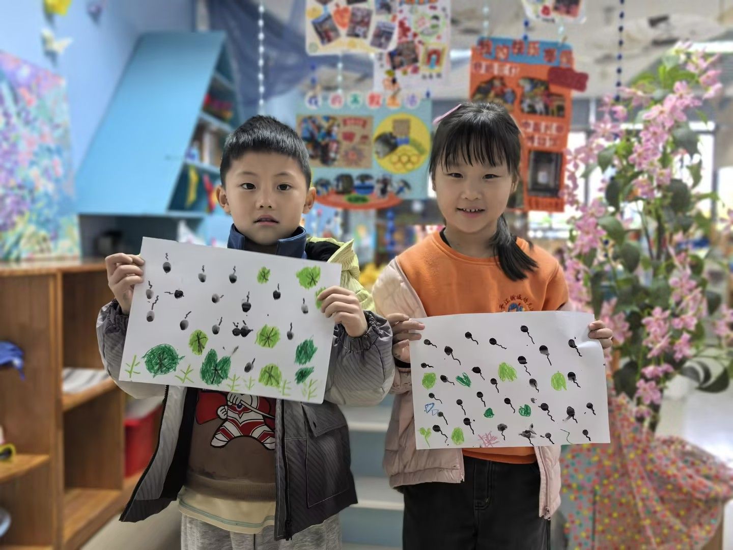 美术活动《小蝌蚪找妈妈》:以绘本故事引入,引导孩子们化身“小小艺术家”。孩子们运用水墨晕染表现蝌蚪的灵动,用撕贴拼画构建池塘生态,或用黏土塑造出青蛙妈妈的立体形象。在“长卷创作”环节,孩子们分工合作,用连续画面完整呈现小蝌蚪寻找妈妈的曲折历程。一幅幅作品中,歪斜的荷叶、鲜艳的水草、圆润的蝌蚪群,无不跃动着稚拙天真的童心。