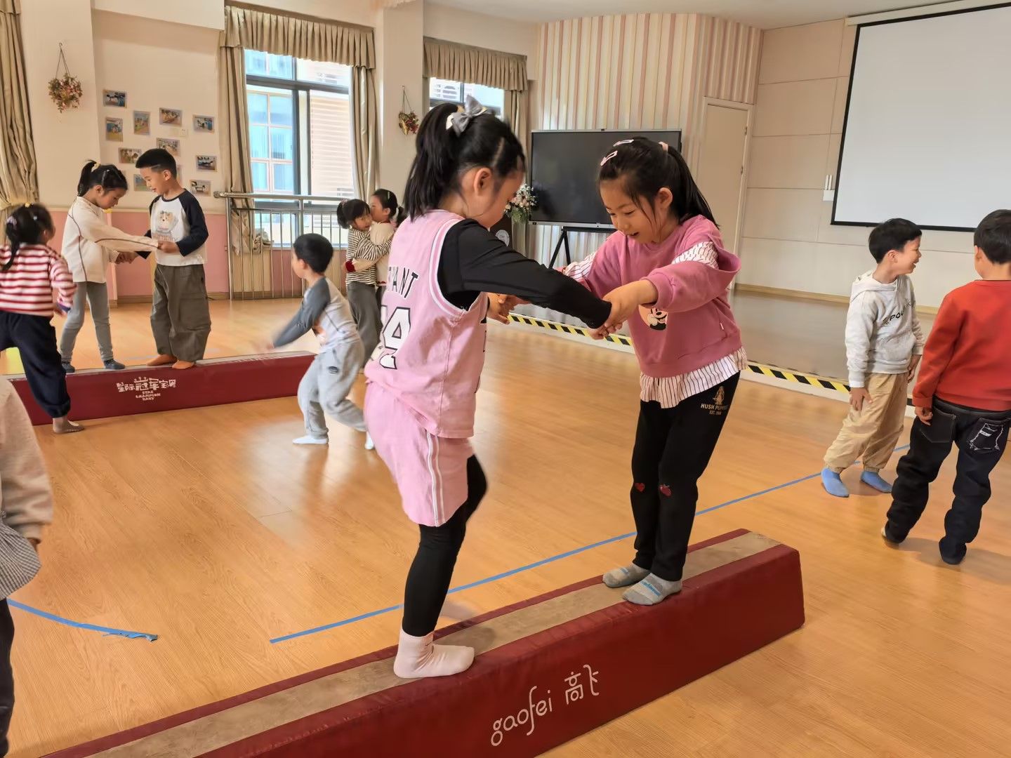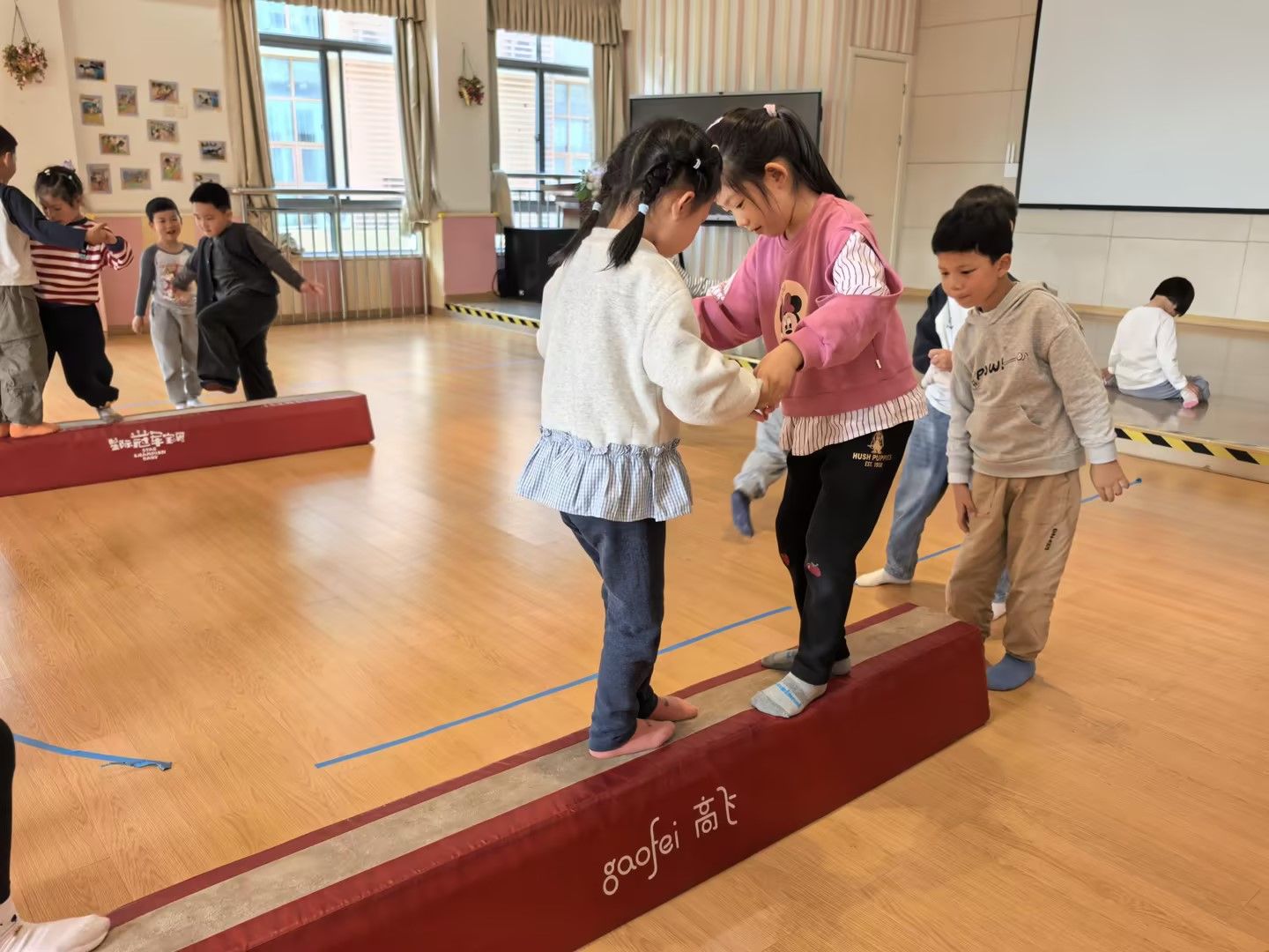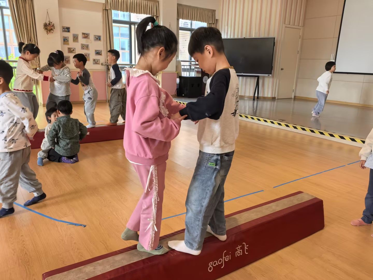一座窄窄的独木桥,两个人怎样才能顺利通过?近日,我们开展了“快乐体操——智勇独木桥”合作挑战活动,孩子们用自己的方式给出了精彩答案。有的面对面慢慢靠近,侧身交错通过;有的前后搭肩,喊着“一二一”的口令同步前行;还有的互相牵手保持平衡,一人走一步等一步。虽然桥面窄、挑战大,但没有一个孩子选择放弃。