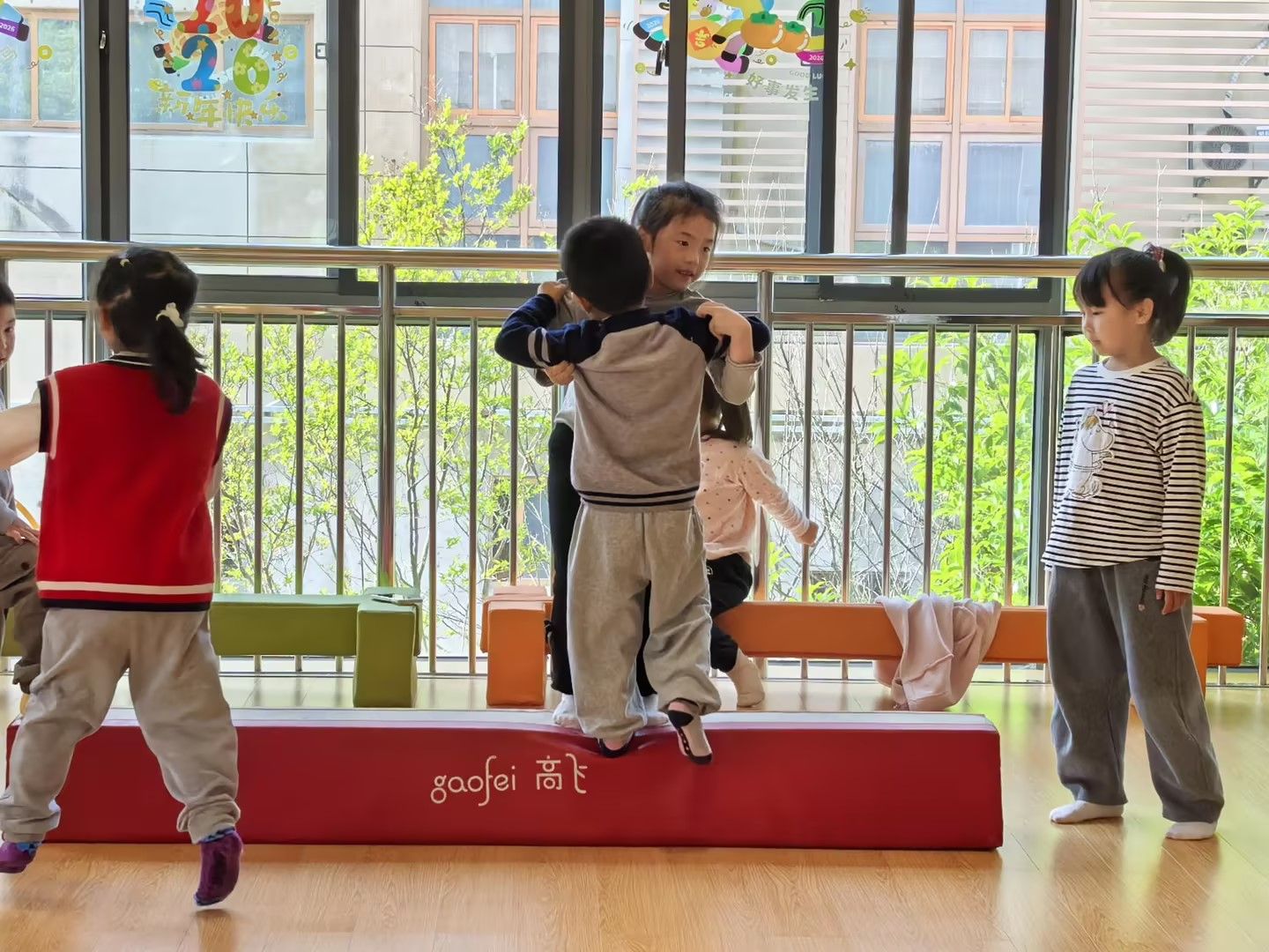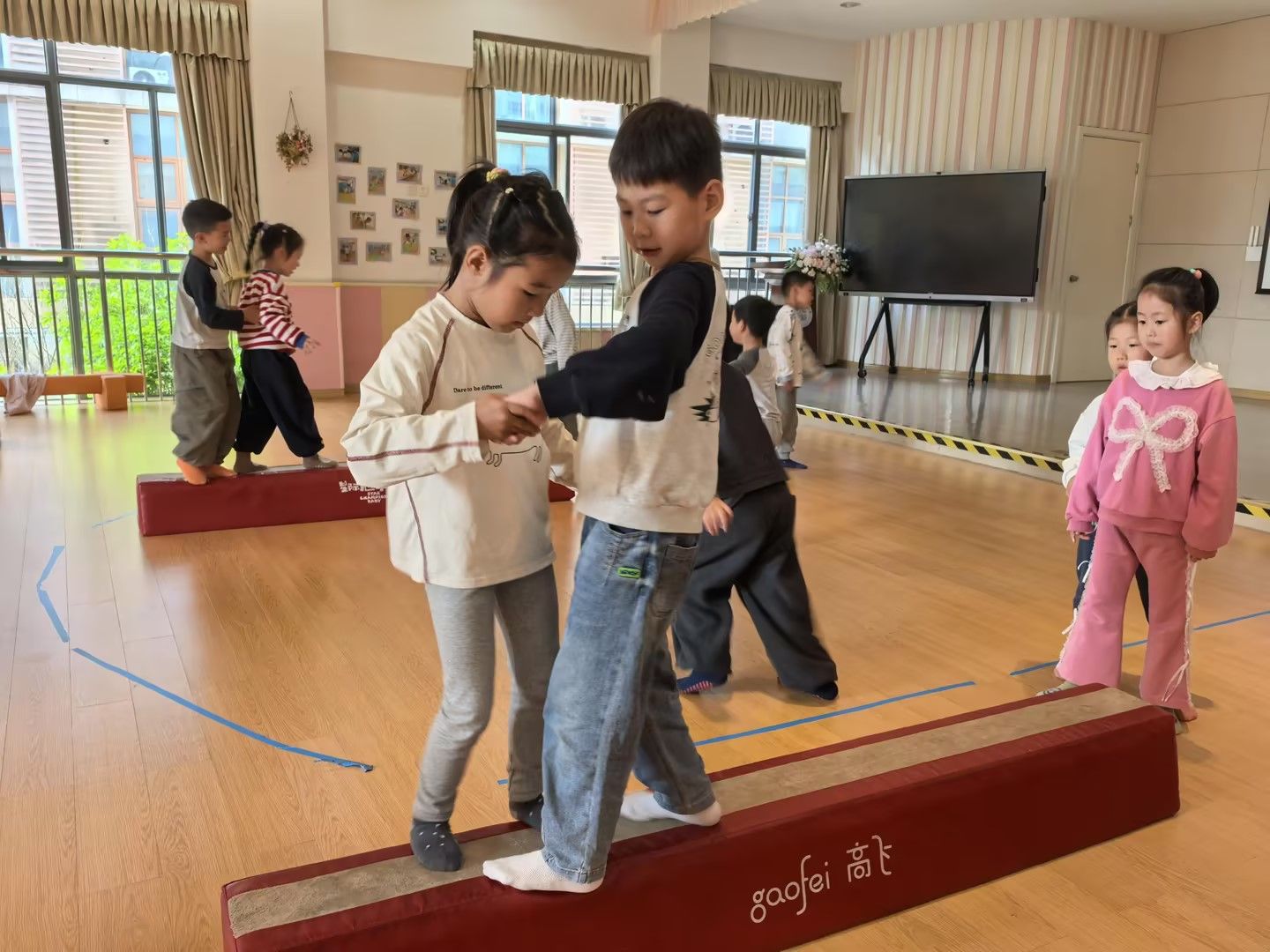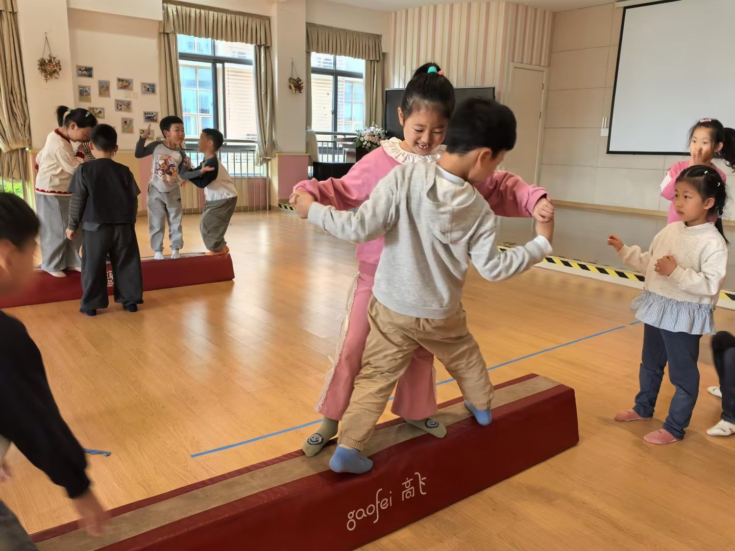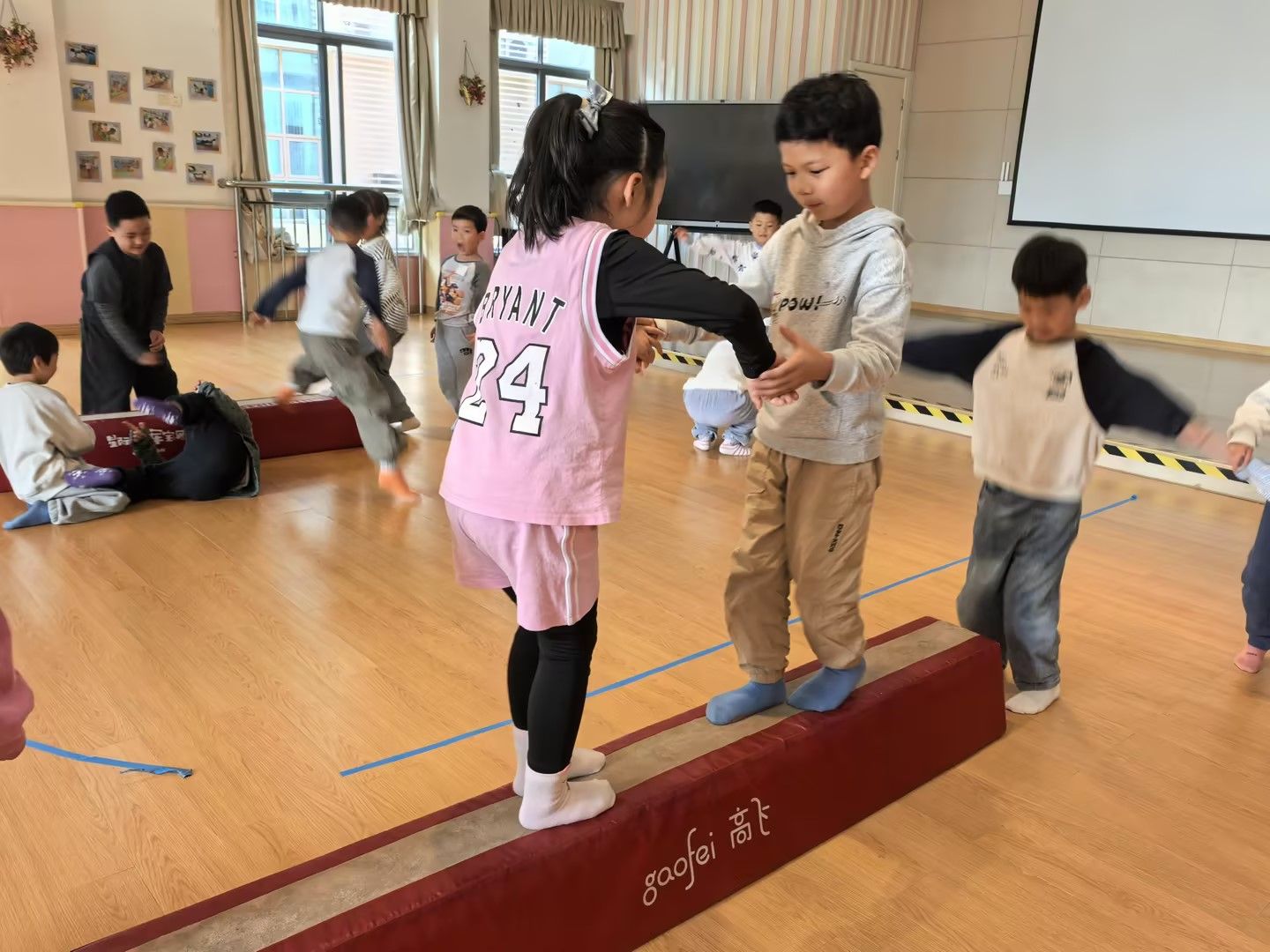 一座窄窄的独木桥,两个人怎样才能顺利通过?近日,我们开展了“快乐体操——智勇独木桥”合作挑战活动,孩子们用自己的方式给出了精彩答案。有的面对面慢慢靠近,侧身交错通过;有的前后搭肩,喊着“一二一”的口令同步前行;还有的互相牵手保持平衡,一人走一步等一步。虽然桥面窄、挑战大,但没有一个孩子选择放弃。