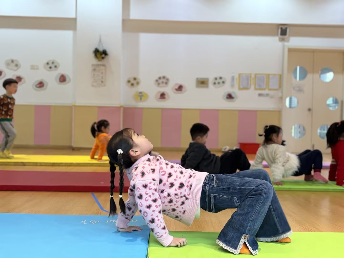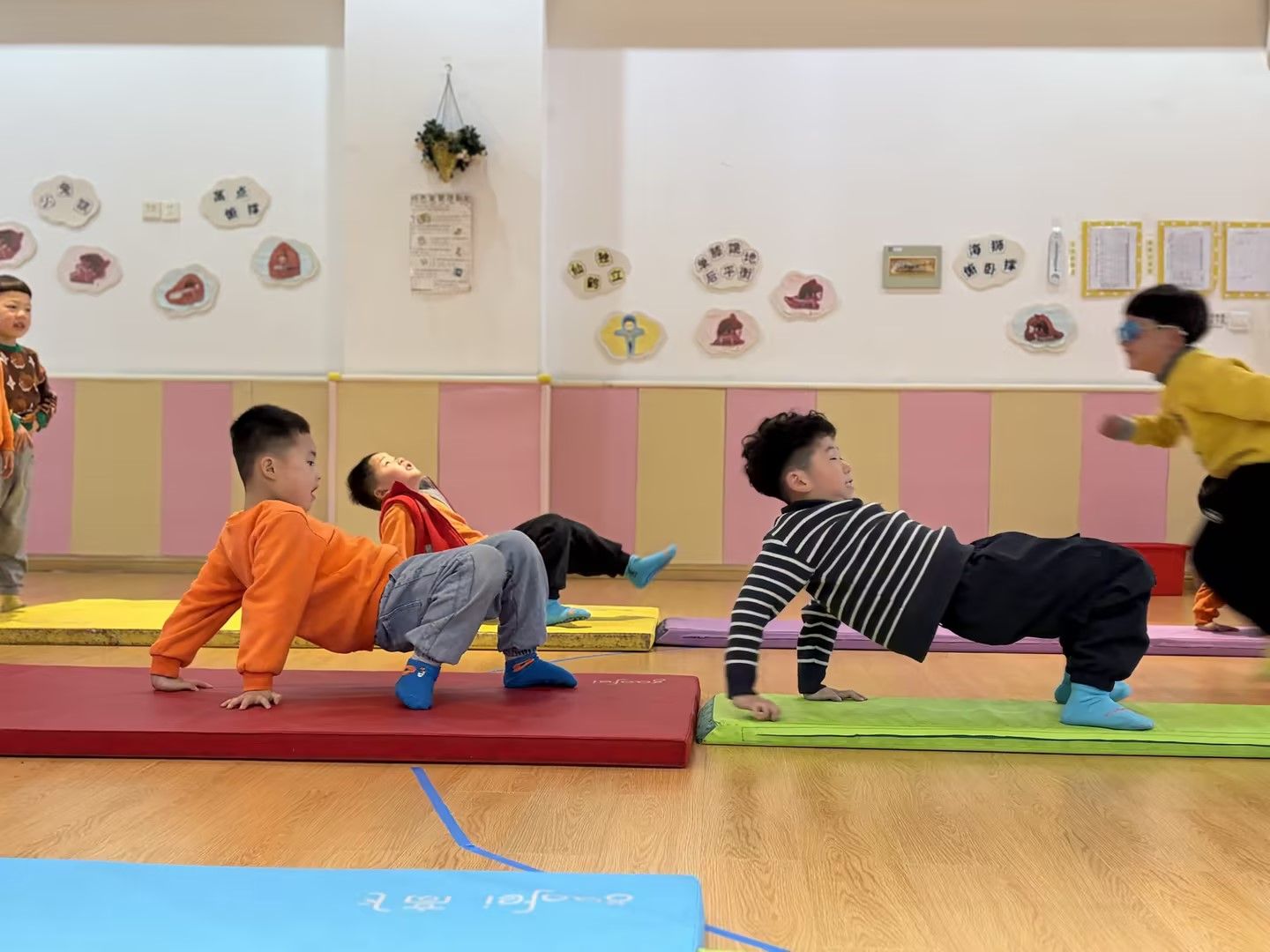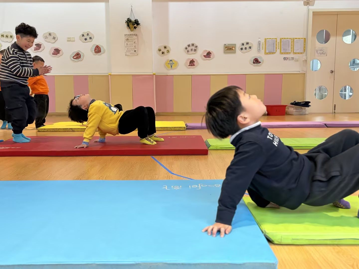 在柔软的体操垫上,孩子们化身活力小勇士,挑战趣味仰爬动作。他们双手撑垫、腹部抬起,努力保持身体平衡,一步步向前挪动。活动室里,孩子们的笑声与努力的加油声交织,既锻炼了核心力量与肢体协调性,又在挑战中收获了满满的成就感,让运动变得生动又快乐。