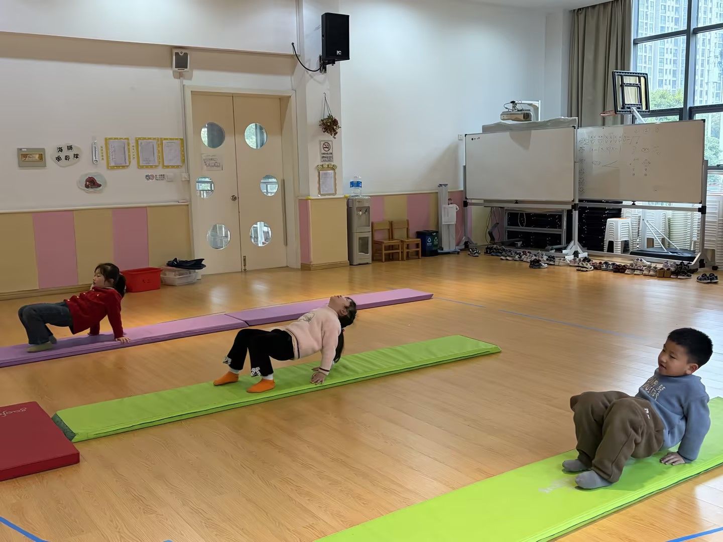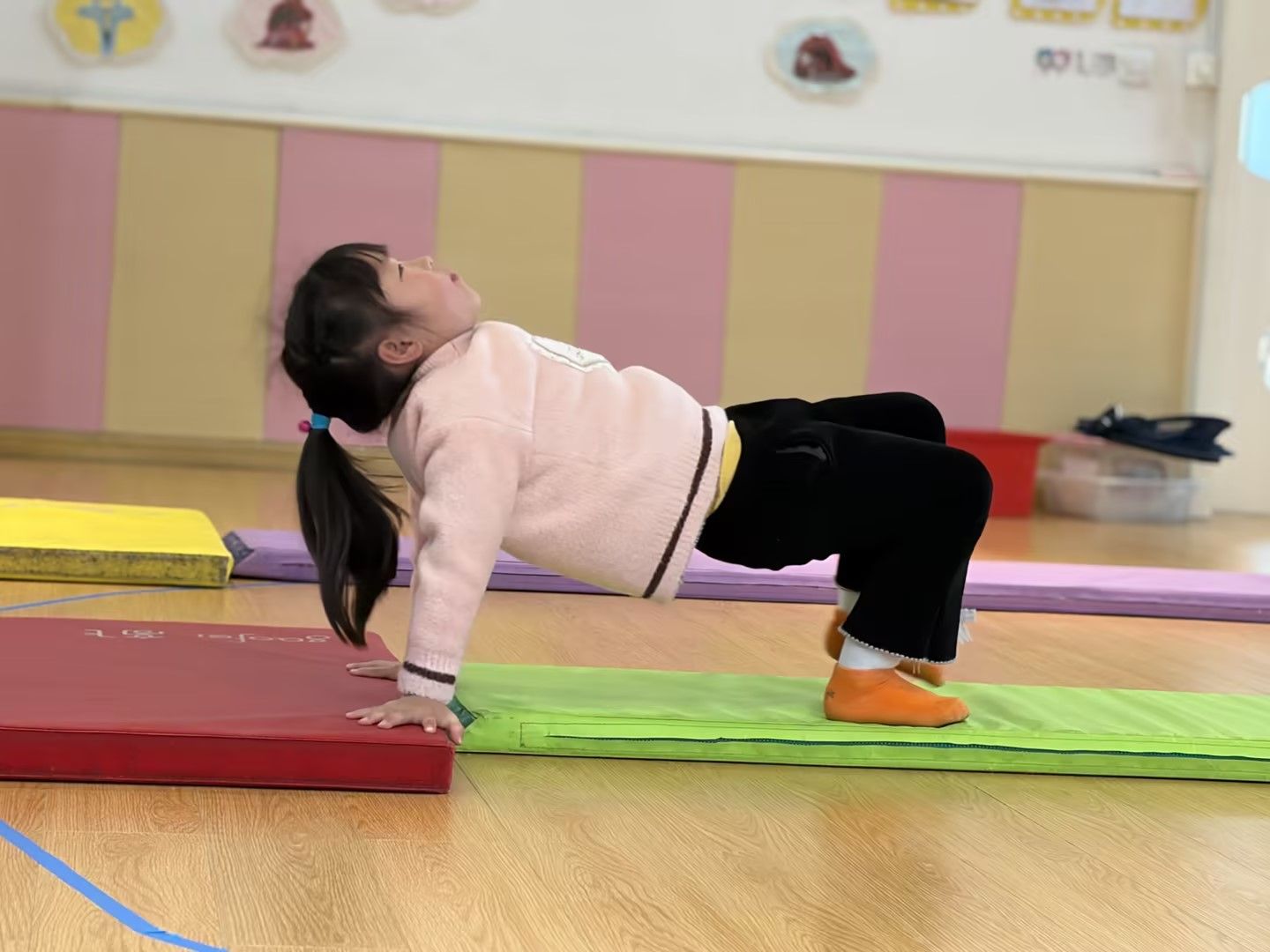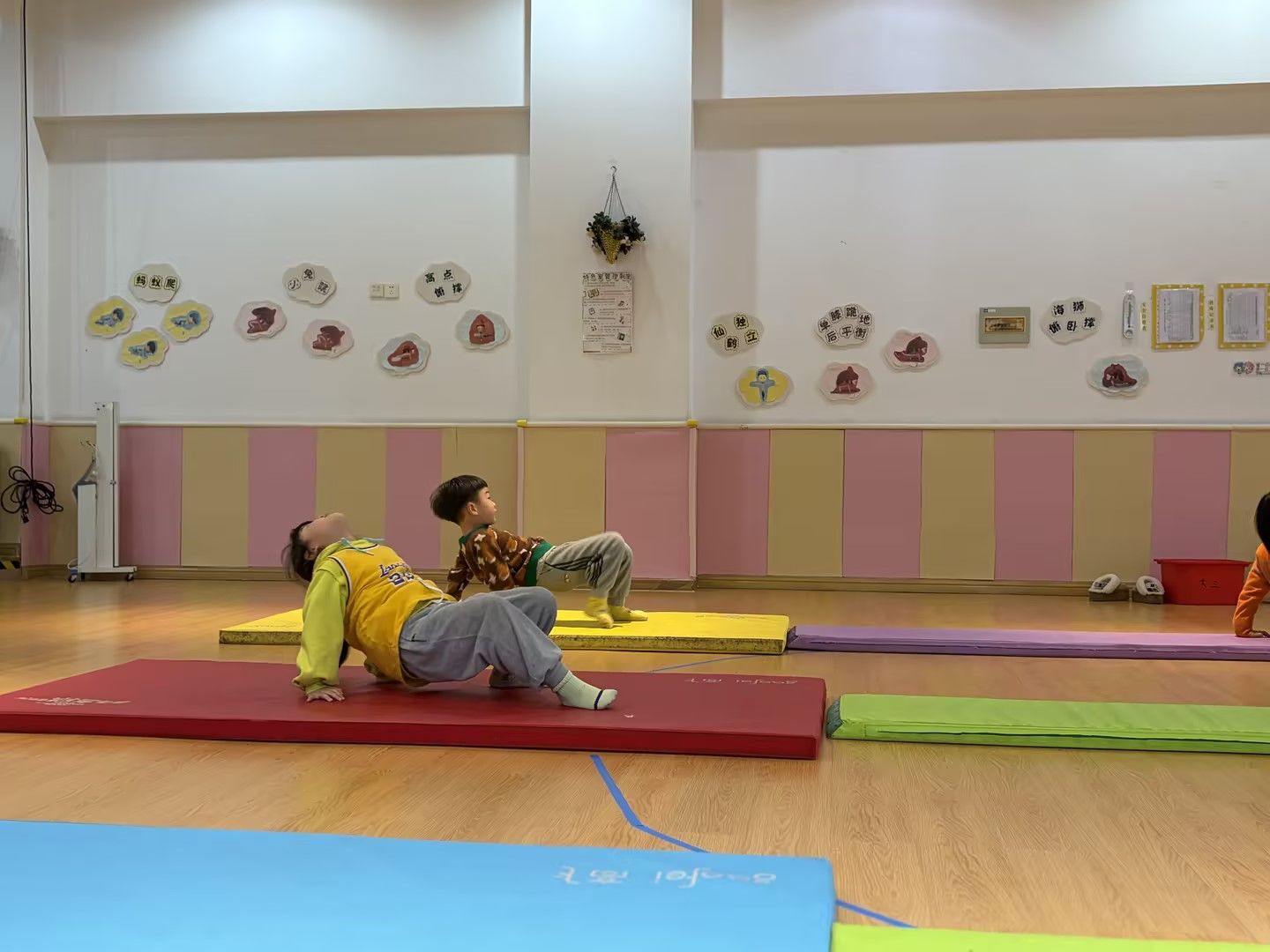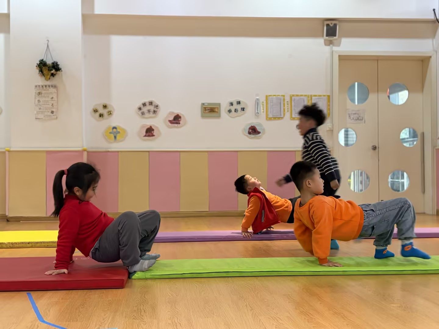 在柔软的体操垫上,孩子们化身活力小勇士,挑战趣味仰爬动作。他们双手撑垫、腹部抬起,努力保持身体平衡,一步步向前挪动。活动室里,孩子们的笑声与努力的加油声交织,既锻炼了核心力量与肢体协调性,又在挑战中收获了满满的成就感,让运动变得生动又快乐。