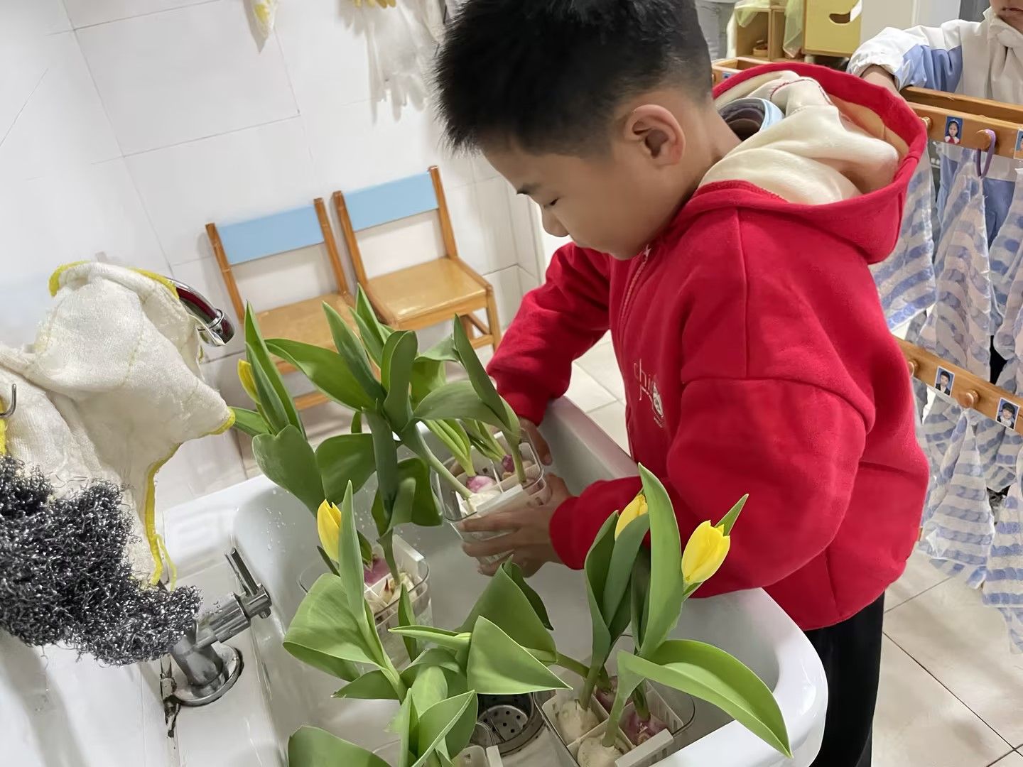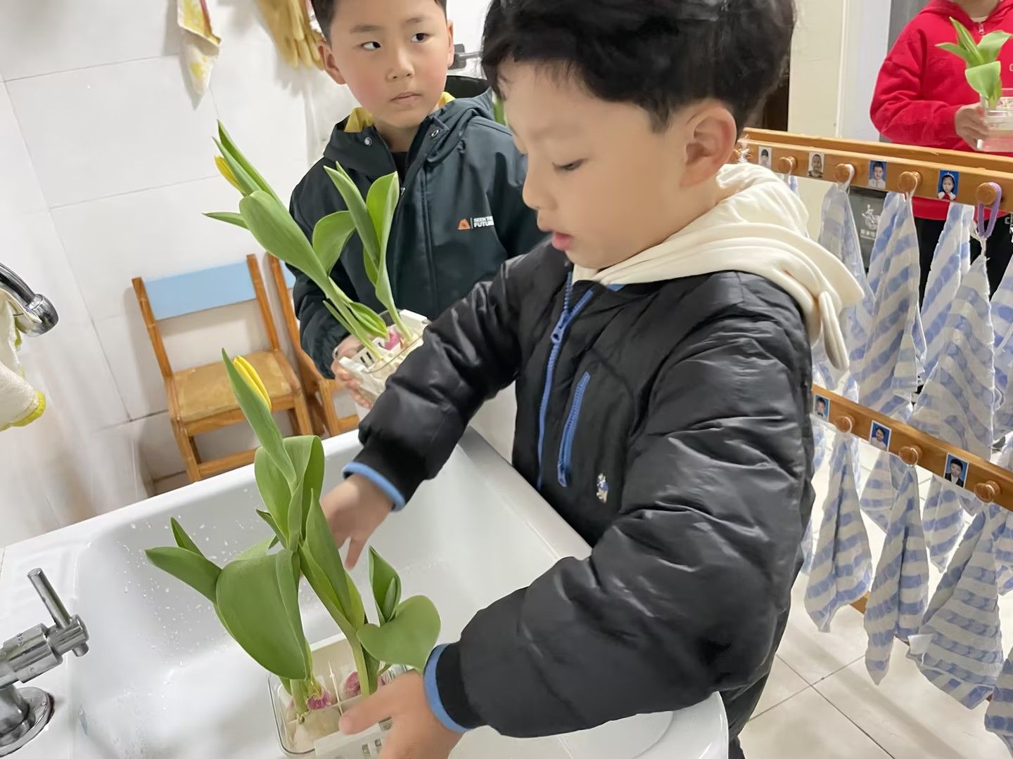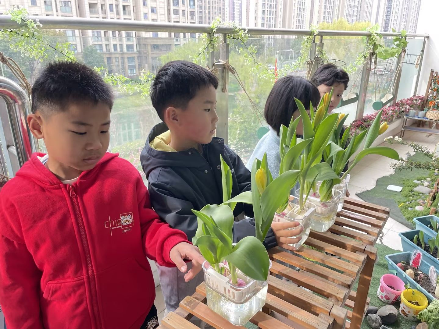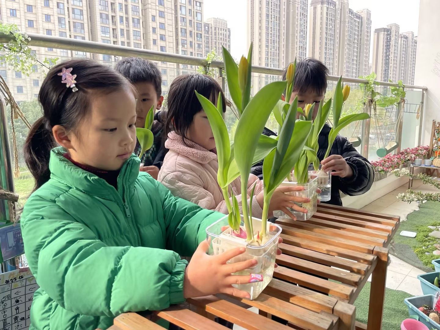阳光明媚的日子里,宝贝们化身小小园艺师,细心照料水培郁金香,静静等待花开;