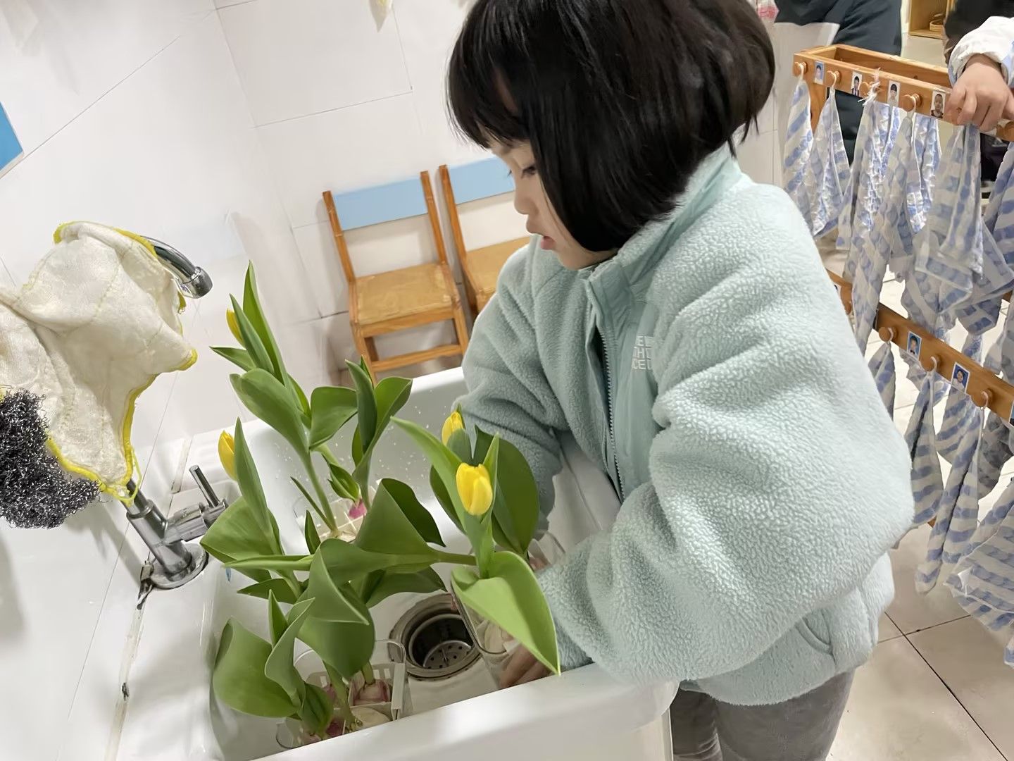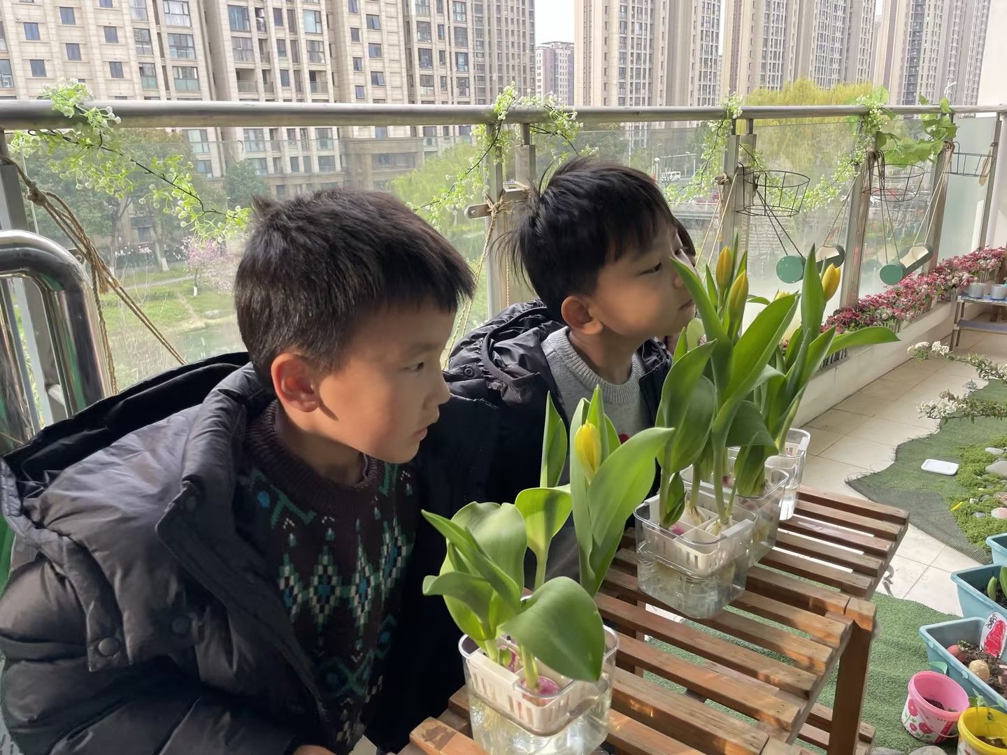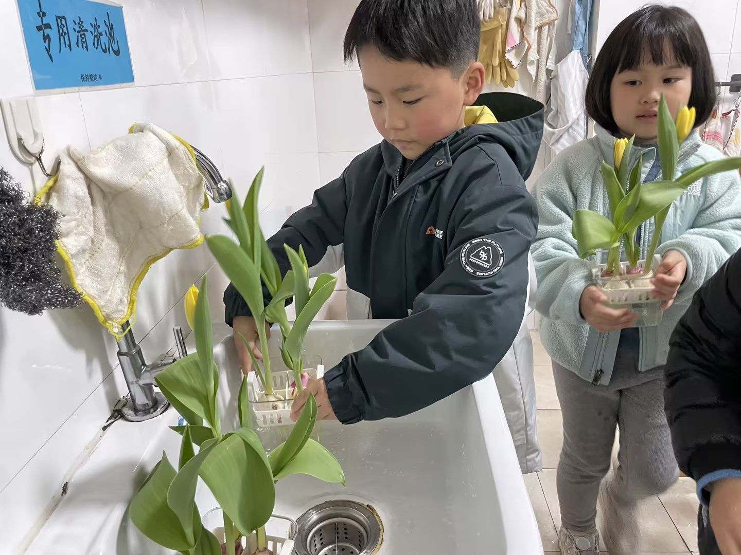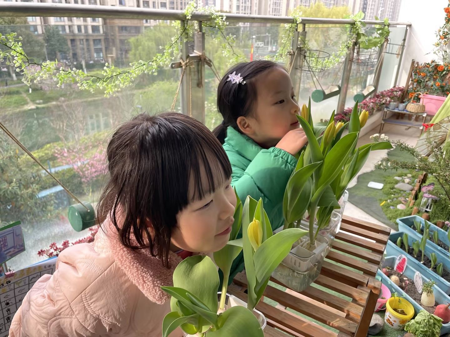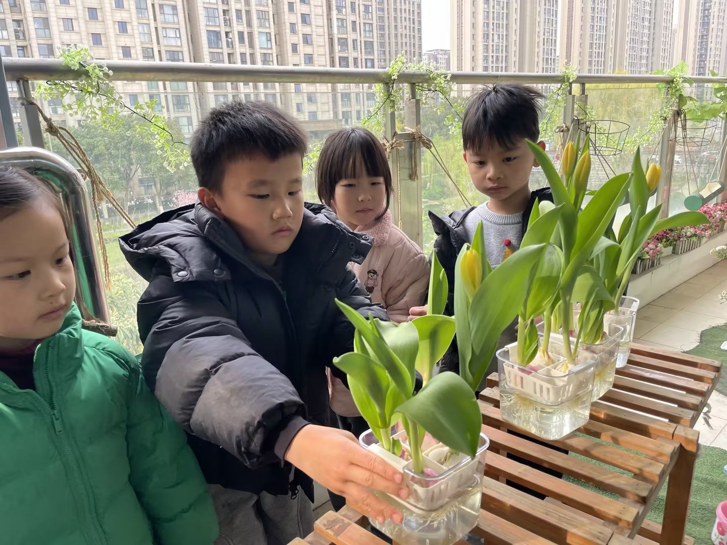 阳光明媚的日子里,宝贝们化身小小园艺师,细心照料水培郁金香,静静等待花开;
